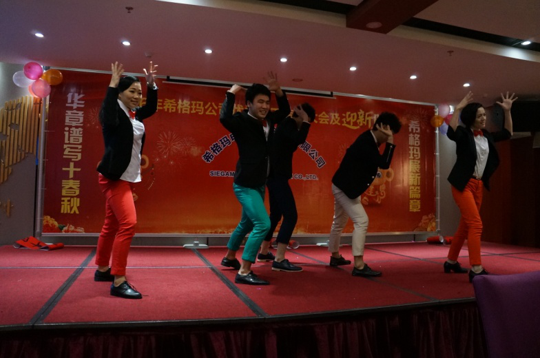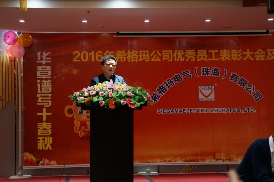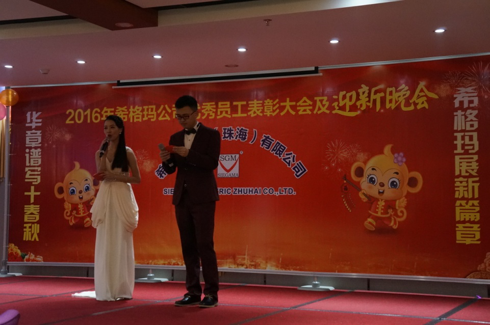 晚上六点十八分年会在欢快的音乐中准时拉开了帷幕,首先,希格玛公司董事长李文勇先生向到场的全体员工、嘉宾朋友致感谢词,感谢全体员工的辛勤付出、以及对希格玛工作给予支持与帮助的合作伙伴致以最诚挚的谢意。李董详细的介绍了希格玛公司2015年的发展历程,他表示:“希格玛公司作为一个在电气行业经营、沉淀了10年的品牌公司。于2015年投入使用自有的全新生产、办公一体化大楼,配套启用先进的办公系统。基于产品质量稳定和质量提升,公司投入资金,进行设备技术改造和生产线升级,同时对旧工艺作了改进和更新换代,对市场反馈的质量问题统筹协调公司相关资源,快速解决质量问题。使希格玛品牌的信赖度和美誉度得到了极大的提升,为营销团队在市场上开拓疆土提供了有力的支撑,公司产品的市场占有率得以稳住,市场份额已恢复回升态势,渠道得到了进一步稳固。2016年公司将继续坚持“以人为本,结合走出去,请进来”的理念,同时将调整战略管理重心,重点从源头抓起,公司自己培养对公司忠诚,实用的复合性人才。加快现代化企业制度建设的步伐,提高技术创新能力,强化营销管理,加强市场数据分析,扩张销售渠道,完善商务管理,落实品牌战略规划,为客户创造更大的让利价值,使客户满意度最大化。使希格玛公司从中获得长远发展和长期利益。”