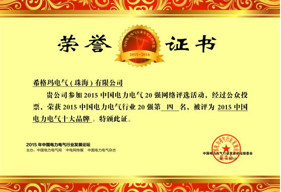 2、 热烈祝贺大发(中国)(珠海)有限公司荣获 2015中国电力电气20强网络评选活动第四名的成绩,被评为“2015中国电力电气十大品牌”称号